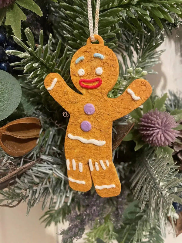 Sød Peberkagemand Juletræspynt i 3D-printet design. Perfekt til at hænge på træet og bringe julens glæde ind i dit hjem. Mål: 63 x 96 x 6 mm.