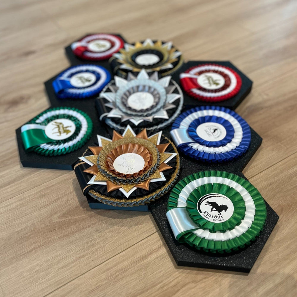Vores rosetholdere er designet med omhu for at sikre, at dine værdifulde rosetter præsenteres på bedst mulig måde. Den heksagonale form giver ikke blot et moderne udtryk, men skaber også et stabilt fundament for sikker ophængning af dine præmier.
