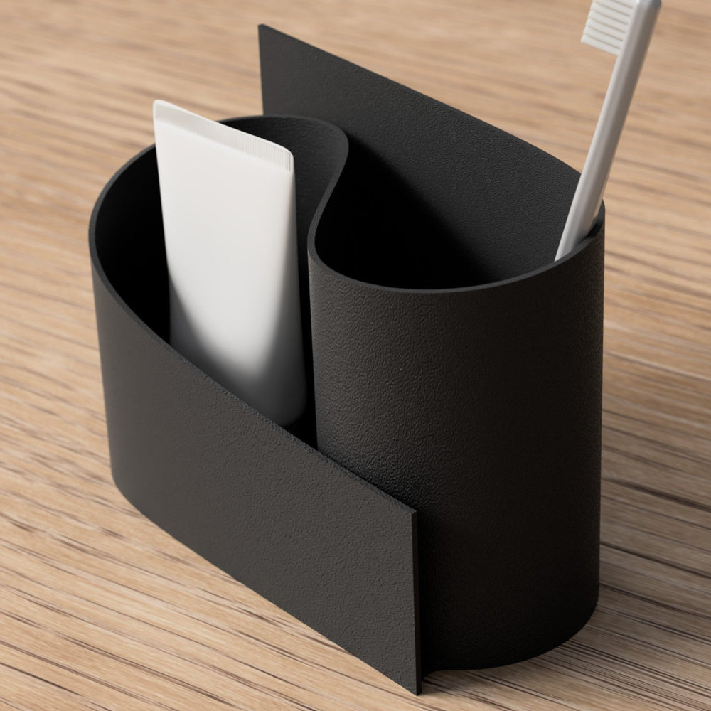 Innovativt dobbelt design: Holderen har et unikt kurvet design med to separate rum - ét til tandbørster og ét til opbevaring af andre badeværelsesartikler som tandpasta, barbermaskine, ansigtsrenseprodukter eller makeup-pensler. Det intelligente design sikrer, at dine ting er adskilt og organiseret, samtidig med at de er let tilgængelige.